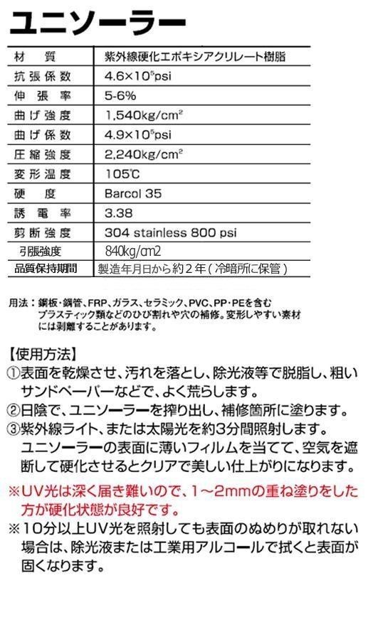 fk094igrjs紫外線ライト、又は太陽光線の照射で硬化します。特殊なジェルがヒビや隙間を素早く補修。タンクやパイプの応急修理に最適です。 製造国:日本 素材・材質:紫外線硬化エポキシアクリレート樹脂 内容量:100g※お届け地域により、別途運賃がかかる場合やお届けできない場合がございますので、お問い合わせ下さい。