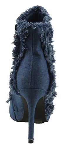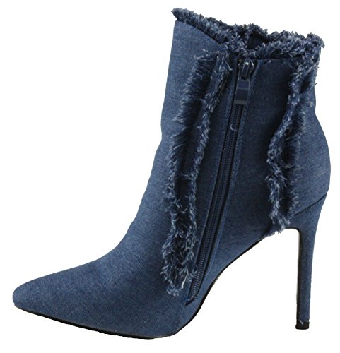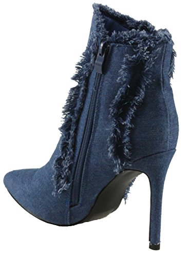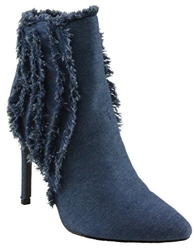 Product Description women's ankle booties, pointed toe, denim fabric upper, denim fringe on the sides and top of the shaft, side zip closure for easy on and off. 0