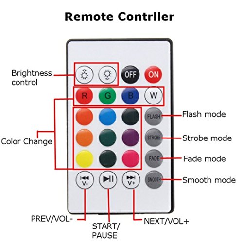 - ✔️REMOTE: This 24-key remote will allow you to choose from White, RGB colors, lighting mode, on/ off, and your choice of brightness through the IR remote