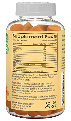 -. Feature : THE BEST TURMERIC CURCUMIN AND GINGER GUMMIES GUARANTEED: These delicious and chewable gummies taste so good we offer an unconditional money back guarantee. They have NO gross ingredients like gelatin, they are vegetarian, kosher and halal certified and GMO-free. / PERFECTLY MADE GUMMIES FOR WOMEN MEN AND CHILDREN: No one likes swallowing pills and there is no reason to. This gummy is formulated to be safe and delicious so you will actually eat them. They are made with natural ingredients and are free of wheat, peanuts, soy, eggs, fish, shellfish and artificial ingredients and flavors. A perfect allergy free gummy just for you. / A BEAUTIFUL UNION OF GINGER AND TURMERIC: Turmeric is a natural anti-inflammatory that can be used to promote overall joint health and comfort. Ginger can soothe upset stomachs and diminish nausea, and help pain and inflammation. / TOP QUALITY: We only want the best health that's why we make high quality premium products for our customers. This product is made in the USA | FDA approved | Gluten Free| Non-GMO and GMP Compliant. No refrigeration needed and can be taken anywhere with you. / WE GUARANTEE SAFETY AND SATISFICATION: A risk-free purchase. You have no need to worry about not loving your purchase as we promise to return 100% of your money if you are not completely satisfied.