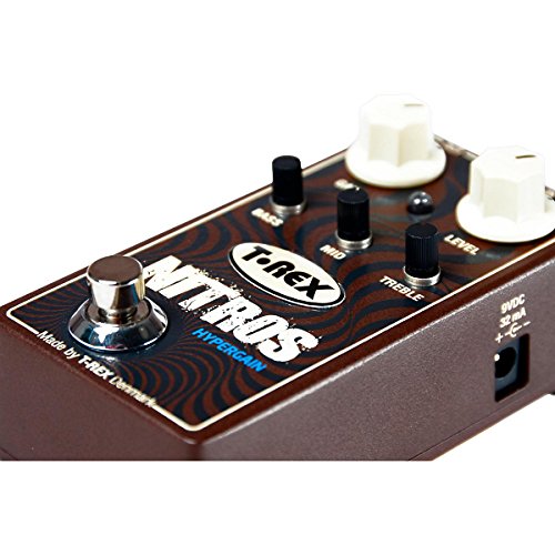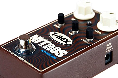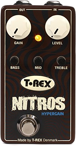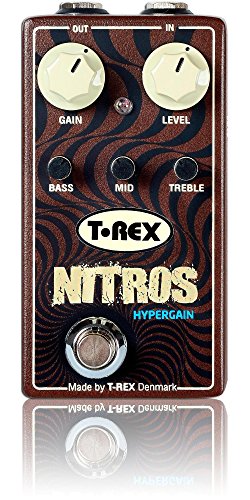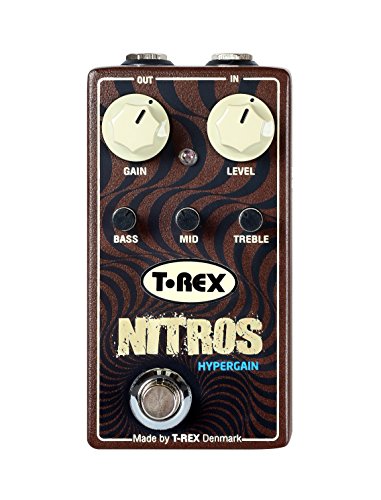 Studio : T-Rex Engineering Publisher : T-Rex Engineering Product Description The Nitros certainly does capture a very punchy and scooped high gain distortion, but being the most tweakable dirt pedal T-Rex makes, it will also do the '80s hair rock sound to a T. And thats with the gain knob set highlower settings are great if you are looking for Texas boogie-rock.By incorporating an active 3-band EQ, the "color" of the distortion is highly adjustable, and the range of the EQ knobs is extremely broad. At moderate cutting/boosting, the Nitros lives in guitar hero land but start turning the knobs to the extremes and all kinds of cool tones will emerge. Anything from "Oops, I forgot to turn off my wah" to "Dude, your amp is facing the wall!" is obtainable - the tones you can get are quite diverse if you really go for it.For over-the-top scooped metal, classic rock or even alternative styles, the Nitros Hypergain will deliver the goods in spades, but its strength lies in how the basic voicing can be altered to taste - and beyond. 0