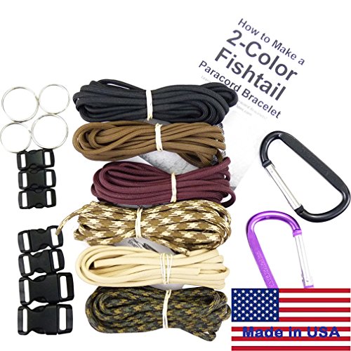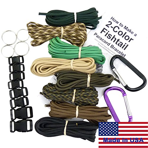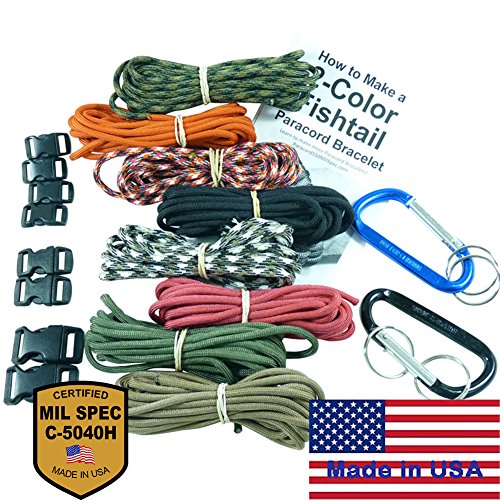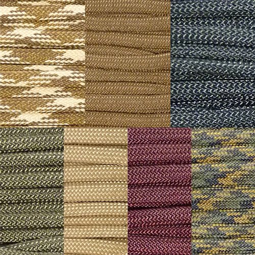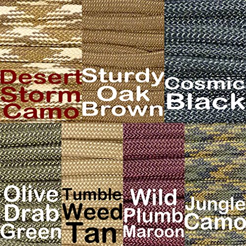 ✓ The "COMMANDO KIT" includes 7 ten-foot hanks of complimentary colors of Paracord: Sturdy Oak Brown, Wild Plumb Maroon, Cosmic Black, Tumbleweed Tan, Desert Storm Camo, Jungle Camo, and Olive Drab Green. This Paracord is 7-strand, Type III, 1,000 Denier Polyester, 550 pound break tested, Parachute Cord, 1/8 inch in diameter, manufactured in the United States.