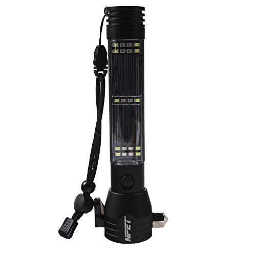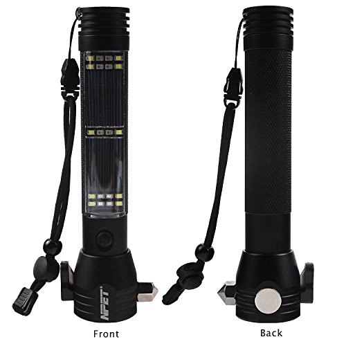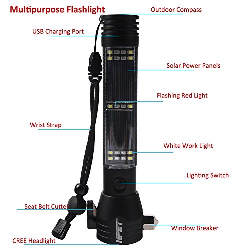 NPET Multi-function LED Flashlight Solar Powered and USB Rechargeable Headlight Headlight/Bright Side Light/ Warning Light with Cutting Knife/ Attack Hammer/ Magnet/ Compass