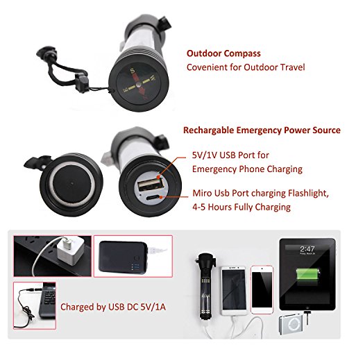 Rechargeable Emergency Power Bank: This solar flashlight has a built-in 2000mAh 18650 battery, could be charged with included USB Cable (4-5hrs) or Solar Power (30hrs), using the USB cable to connect your phone with the flashlight and charge your phone for emergency
