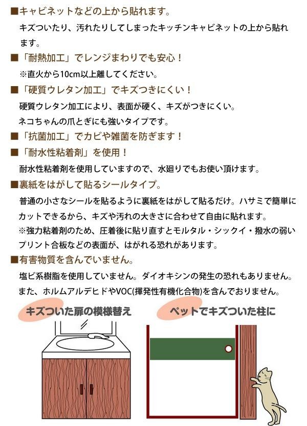 | 木目タイプの硬質ウレタン加工が施されたシートです。キズのついた扉の模様替えや、ペットにキズつけられら柱などにお使いください。 |