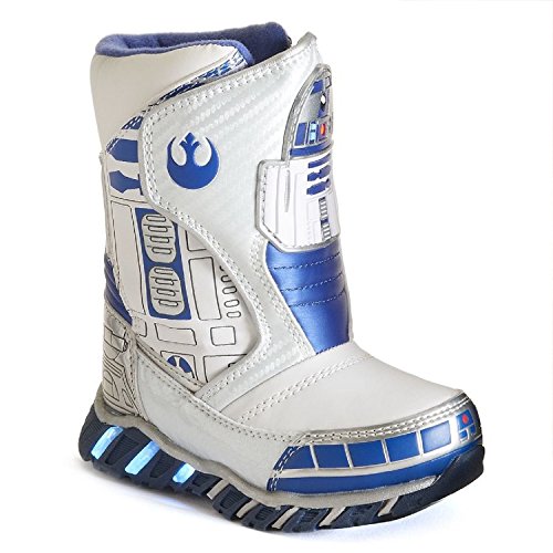 BOOT FEATURES •R2D2 graphics •Light-up sole adds a cool effect •Fleece lining provides a cozy fit •Hook-and-loop closure BOOT CONSTRUCTION •Synthetic upper •Rubber midsole and outsole BOOT DETAILS •Pull-on •Hook-and-loop closure •Padded footbedFeature