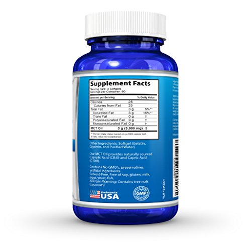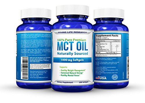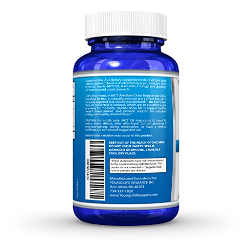 -. Feature : YOU WANT a QUALITY MCT OIL - Unlike the others we use only the best 100% Pure Premium MCT Oil in softgels, so it's convenient when you travel or when you don't have time for bulletproof coffee. / IS IT PURE or FULL OF CHEAP, UNDESIRABLE INGREDIENTS? Yes it's pure. It contains No GMO's, solvents, preservatives, or artificial ingredients. And it's free of soy, gluten, milk, eggs, yeast, fish. It's made in the USA in a GMP certified facility. / IS THIS A GOOD DEAL? - Sure you can get cheaper MCT Oil, but is it made only from 100% Pure Premium Medium Chain Triglyceride Oil containing beneficial caprylic acid C8? There are lots of choices, but only Young Life Research stands out from the crowd. You get 180 Softgels per bottle! / 100% MONEY BACK GUARANTEE. We are so confident in our MCT Oil that we back it with a NO HASSLE RISK FREE 90 day money back guarantee. If for any reason you're not completely satisfied, simply contact us and we'll give you a 100% refund. Our number one P.R.Iority is to make sure you're happy! / PROVEN HEALTH BENEFITS - MCT Oil is a beneficial fat that is easily digested and rapidly metabolized in the liver where it's converted to ketones, which are an excellent source of energy. Studies show MCTs support healthy weight management, and provide sustained energy and mental focus.* Try it out now and experience the Young Life Research difference!