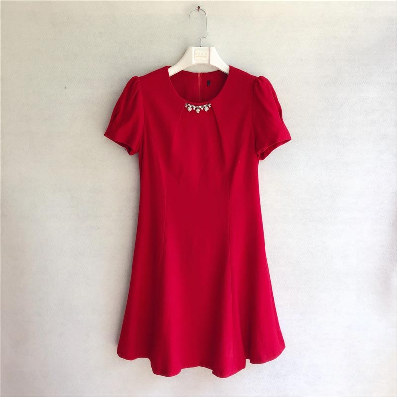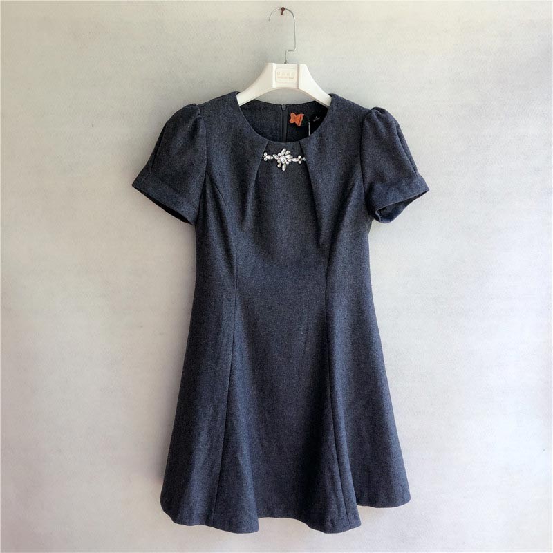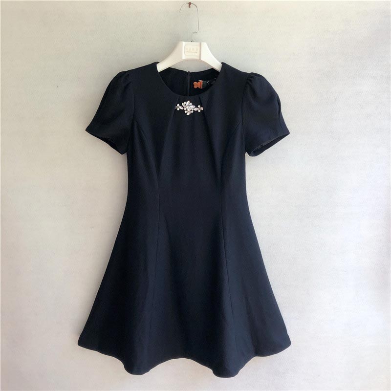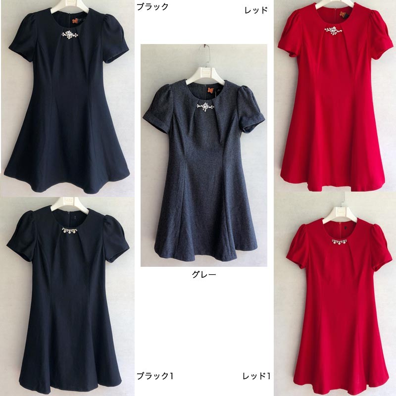 胸元にビジューモチーフ付きのラウンドネック半袖ミニ丈ワンピース!