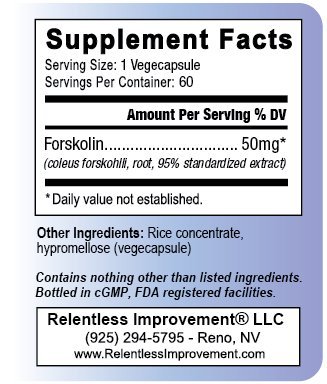 -. Binding : Health and Beauty -. Brand : Relentless Improvement -. EAN : 0854463005382 -. Feature : High-purity pharma-quality, only rice concentrate as excipient / 95% standardized extract means all active with no impurities / Be a careful shopper! This Forskolin is a 95% standardized extract. Other products frequently are much lower potency. If they don't *clearly* disclose "x% standardized extract", you are being ripped off with a low-purity product! -. IsAdultProduct : 0 -. Label : Relentless Improvement -. Manufacturer : Relentless Improvement -. MPN : RIFOR -. PackageQuantity : 1 -. PartNumber : RIFOR -. ProductGroup : Health and Beauty -. ProductTypeName : HEALTH_PERSONAL_CARE -. Publisher : Relentless Improvement -. Studio : Relentless Improvement -. Title : Forskolin 95% 50mg Vegecapsule 60 count. High potency, high-purity = real results with no stomach upset -. UPC : 854463005382