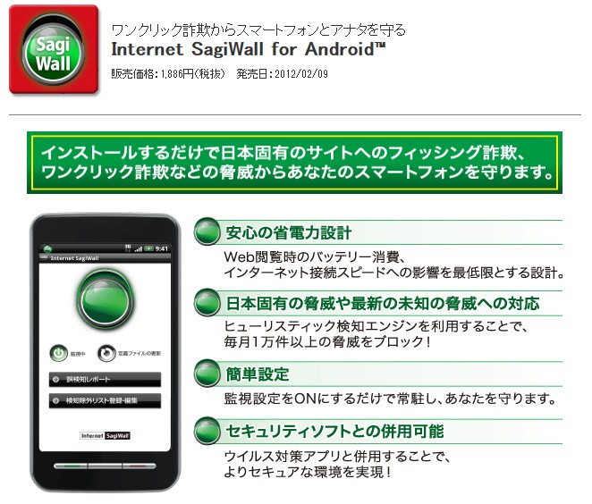 | 備考 | Internet SagiWall for Androidは、独自の検知技術を利用してサイトの安全性を判断するお手伝いをいたします。しかしながら、サイトが詐欺等の目的であるかどうかの法的な 判断を行うものではありません。Internet SagiWall for Androidは、利用者ご自身の責任で 利用していただくものであり、提供者は、そのご利用について、一切の責任を負いません。 |