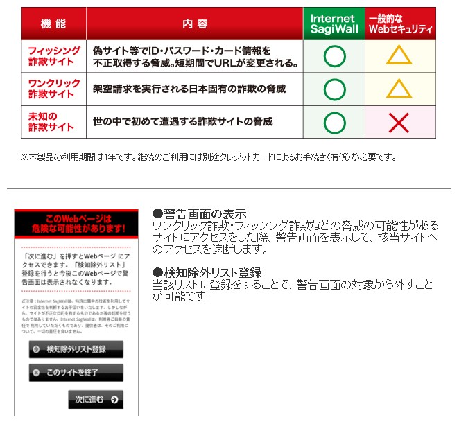 | 製品内容 | ◆Internet SagiWall for Androidとは? Android端末の標準ブラウザやChromeブラウザ(※)にて、SNS・掲示板やインターネットバンキング、ネットショッピングサイトなどを閲覧する際、フィッシング(なりすまし)詐欺、ワンクリック料金請求詐欺など、ネット詐欺サイトを警告します。 Webサイト閲覧時の詐欺被害を未然に防ぎ、安心してインターネットを楽しめます。 ◆このような被害にあう前にブロック! ◆次世代型技術 『SagiWallエンジン』を搭載! |