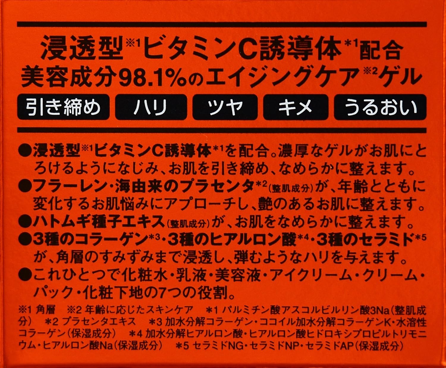 高浸透※1ビタミンC(APPS*)配合オールインワンゲル※1 角層まで*パルミチン酸アスコルビルリン酸3Na(整肌成分) 内容量:120g 無香料/無合成着色料/無鉱物油/パラペンフリー/アルコールフリー スキンタイプ:全肌質対応 エッセンシャルオイルの香り ・グレープフルーツ ・オレンジ 商品サイズ (幅×奥行×高さ) 幅66mm×奥行66mm×高さ55mm 使用目安:約2~2.5か月 原産国:日本