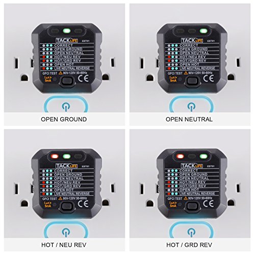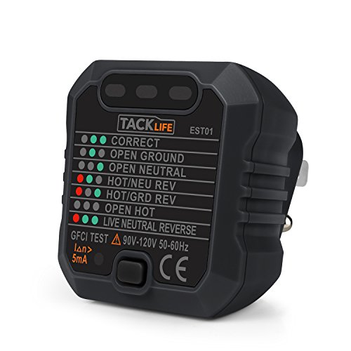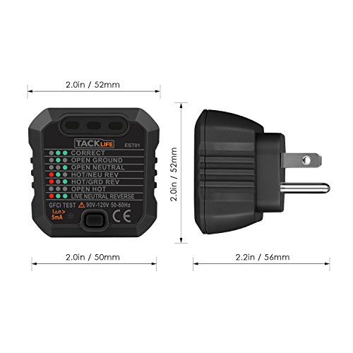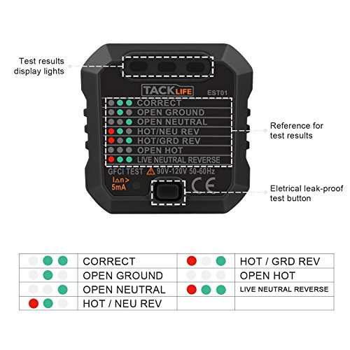 - ▲WHAT YOU GET - Tacklife EST01 Advanced GFCI Outlet Tester (US Plug 3 Pin Plug), English User's Manual, Tacklife Warranty Card, 24-Month Warranty