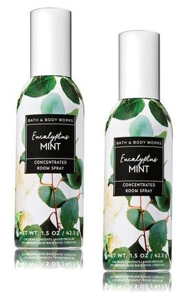 -. Binding : Kitchen -. Brand : Bath & Body Works -. EAN : 0672823953513 -. Feature : 2 pack eucalyptus mint concentrated room spray. / Eucalyptus mint: Fresh Eucalyptus, Sweet Spearmint, Lemon Peel, Clary Sage / Refresh with two quick bursts of fragrance and fill every room. / Content 1.5 Oz / 42.5 g -. Label : Bath and Body Works -. Manufacturer : Bath and Body Works -. ProductGroup : Home -. ProductTypeName : HOME -. Publisher : Bath and Body Works -. Studio : Bath and Body Works -. Title : Bath and Body Works 2 Pack Eucalyptus & Mint Concentrated Room Spray. 1.5 Oz. -. UPC : 672823953513