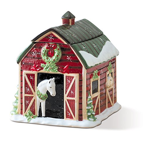Studio : Susan Winget Publisher : Susan Winget Product Description eep Santa's favorite cookies fresh with a beautiful Christmas Cookie Jar by Susan Winget perfect for beckoning in the holiday season. This Christmas cookie jar features a lovely 3-D barn design adorned with mistletoe and snow. With a beautiful stallion peering out of the doors, this Christmas cookie jar by Susan Winget makes a beautiful addition to any collection of holiday decorations and helps keep your favorite Christmas cookies fresher longer. 0