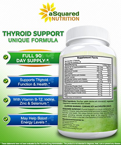 aSquared Nutrition's Premium Thyroid Support Supplement is a unique blend of herbs, vitamins, minerals, and amino acids shown to support a healthy thyroid, increase energy, boost metabolism, and increase overall wellbeing! Plus we are offering 180 Capsules (90 Days of Supply). That's a tremendous deal, since most other brands offer half the amount for an even more expensive price. *