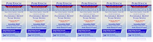PureTouch MEDICATED Tush Wipes - Individual Flushable Moist Wipes are indicated for hemorrhoidal, feminine, and hygienic CARE! Our formula consist of 50% Witch Hazel with Aloe Vera, Vitamins E,C, & A. Our Medicated Tush Wipes contain natural moisturizers to leave you feeling fresh and clean. They contain vitamins that benefit and nourish your skin. These Single-Use-Packets make it convenient to use at home, at work, when you travel or anywhere you GO!Feature
