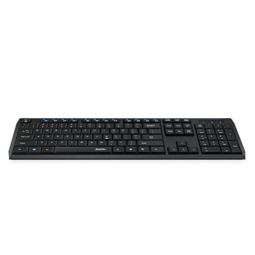 ERGONOMIC 104 KEY WIRELESS KEYBOARD; Full-size splash resistant Keyboard with Numeric Keypad and adjustable typing angle, 12 hot keys for instantly accessing your music, internet, e-mail, volume, and more