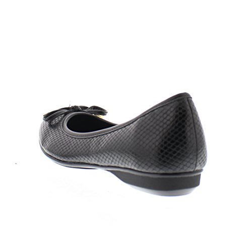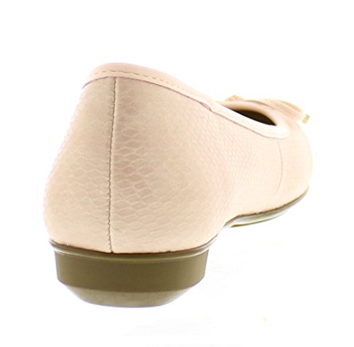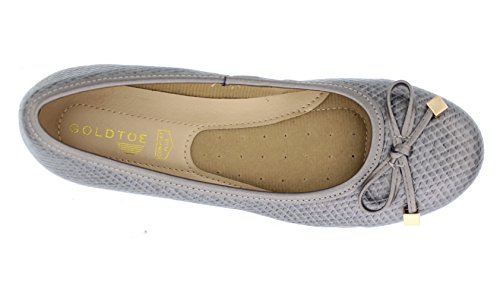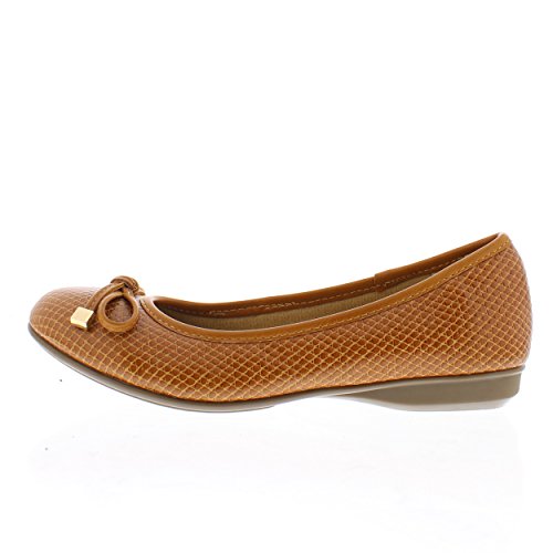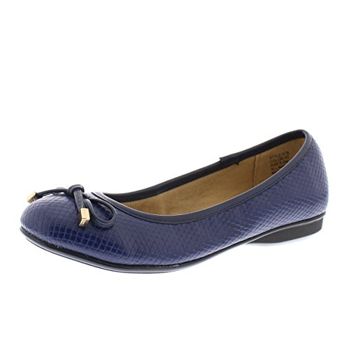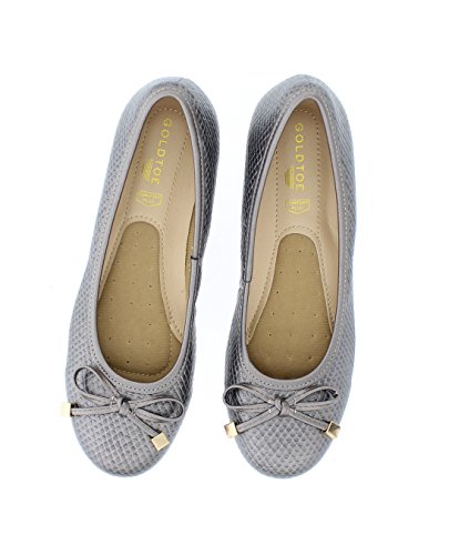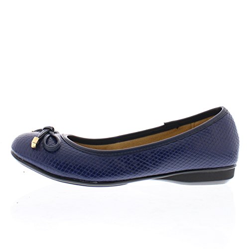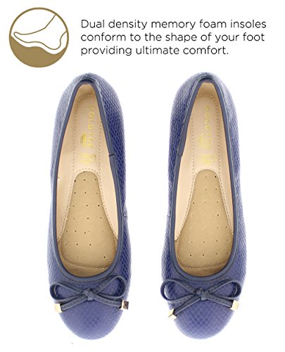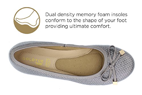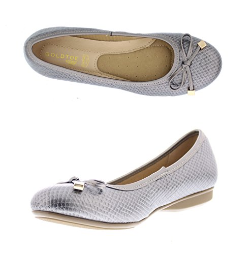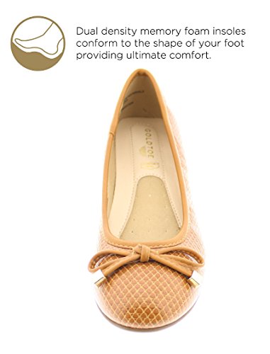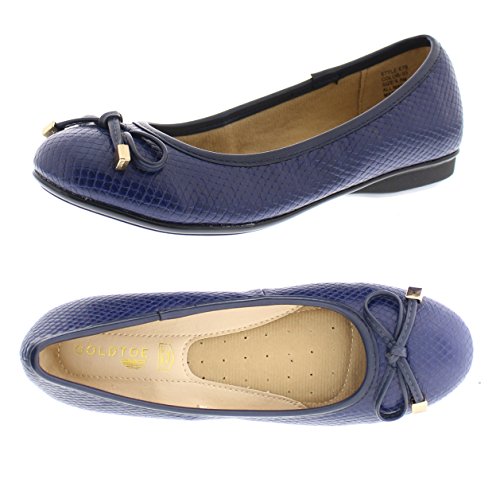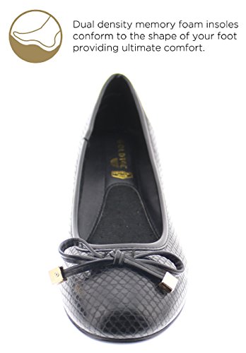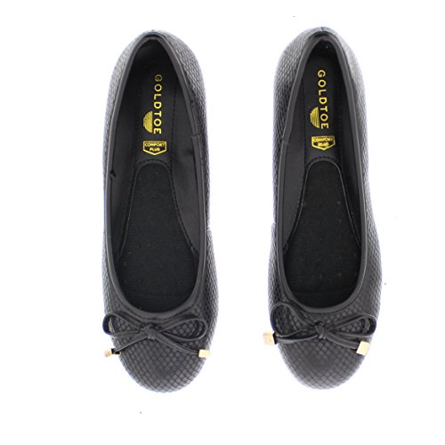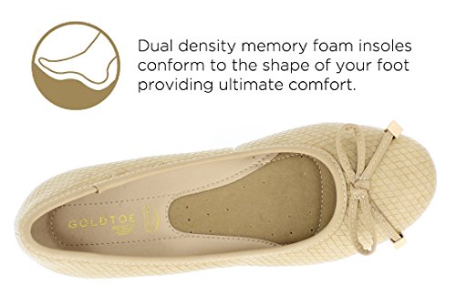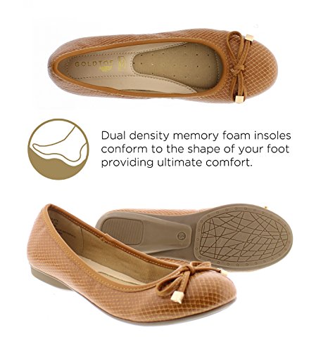 Achieve effortless style in the GOLDTOE® Malorie ballerina pump. This comfortable and versatile pair of classic ballet flats with arch support and memory foam is elevated with a mini wedge heel to polish off a sophisticated look. These women's flats are a classic wardrobe staple tailor made to wear from work to weekend. Features an easy to wear slip-on vegan leather almond toe ballet flat with a faux snakeskin embossed design highlighted with a pretty bow at the toe box and capped with gold metallic hardware details for a touch of class. This everyday women's comfort shoe is constructed with a dual density memory foam molded footbed to soften every step and provide the utmost cushioned support for your feet, ideal for all day wear. Available in timeless colors for every day wear to stylishly coordinate with any outfit. Choose your next new pair of everyday flats in black, camel brown or navy blue. Size and Fit Guide - These ballet flats for women are available in medium and wide width sizes for reliable fit and custom comfort.