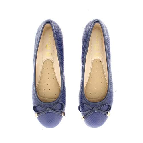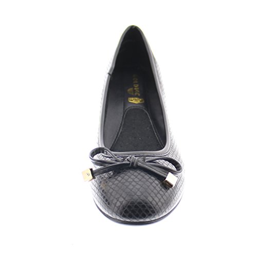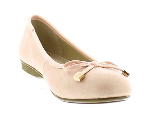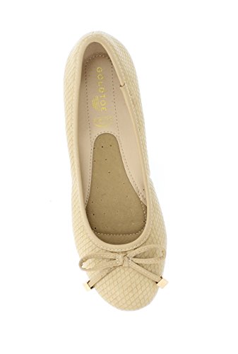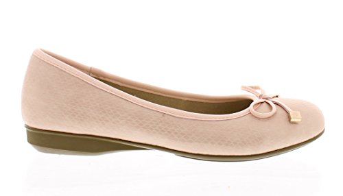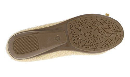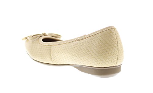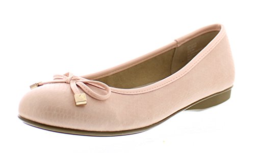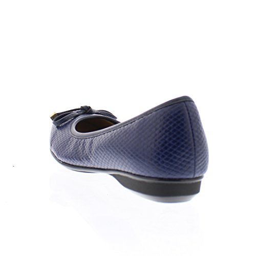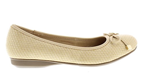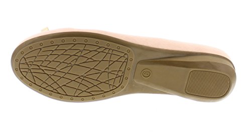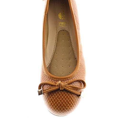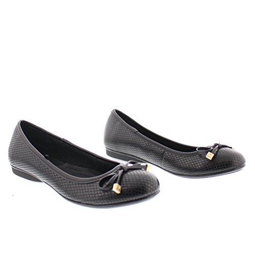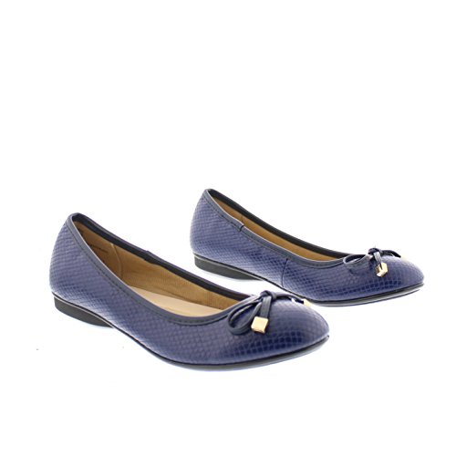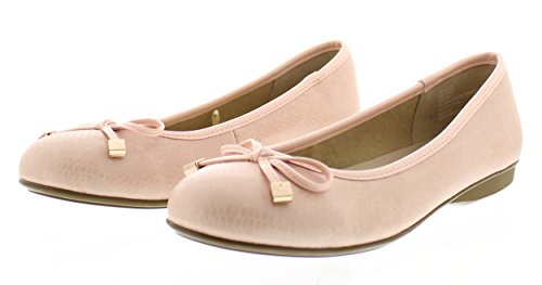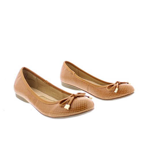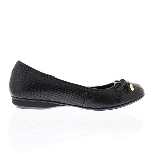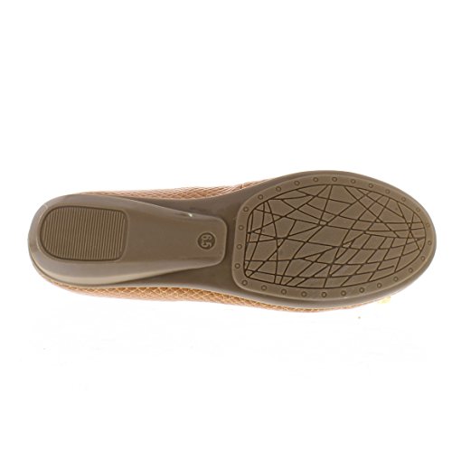 Achieve effortless style in the GOLDTOE® Malorie ballerina pump. This comfortable and versatile pair of classic ballet flats with arch support and memory foam is elevated with a mini wedge heel to polish off a sophisticated look. These women's flats are a classic wardrobe staple tailor made to wear from work to weekend. Features an easy to wear slip-on vegan leather almond toe ballet flat with a faux snakeskin embossed design highlighted with a pretty bow at the toe box and capped with gold metallic hardware details for a touch of class. This everyday women's comfort shoe is constructed with a dual density memory foam molded footbed to soften every step and provide the utmost cushioned support for your feet, ideal for all day wear. Available in timeless colors for every day wear to stylishly coordinate with any outfit. Choose your next new pair of everyday flats in black, camel brown or navy blue. Size and Fit Guide - These ballet flats for women are available in medium and wide width sizes for reliable fit and custom comfort.