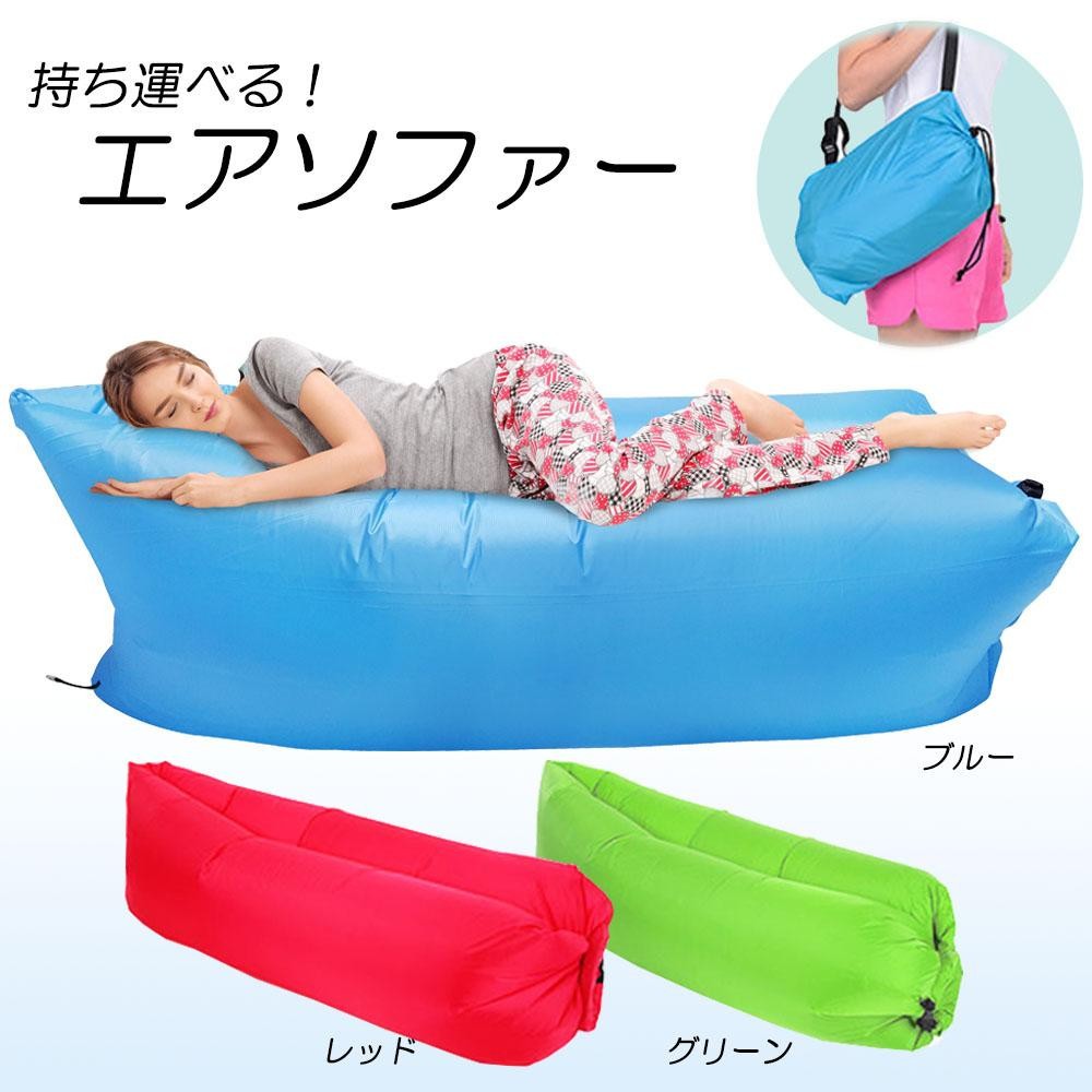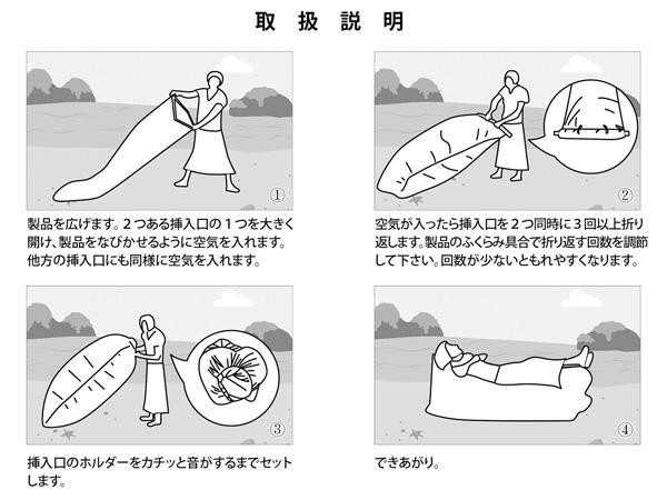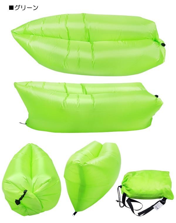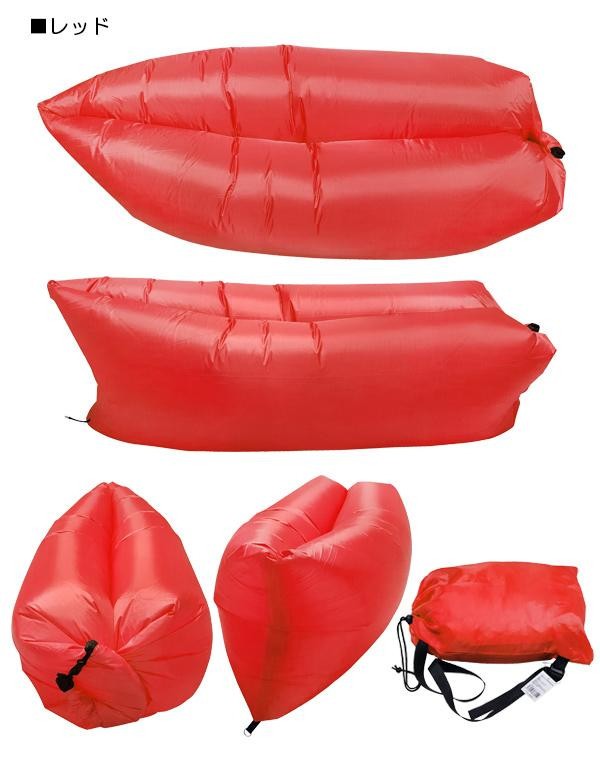 空気を入れて、口を閉めるだけでソファベッドが完成します。折りたたんで持ち運べるのでビーチやキャンプなど屋外での使用にピッタリです。大きな男性でも寝ころべるサイズです。 |