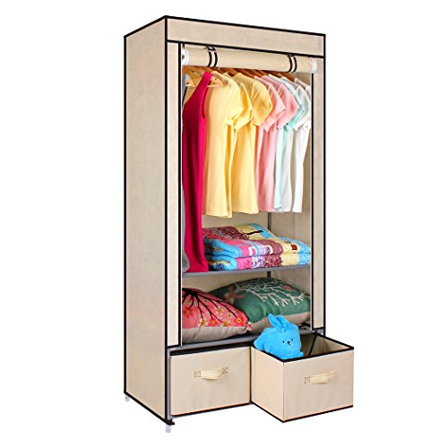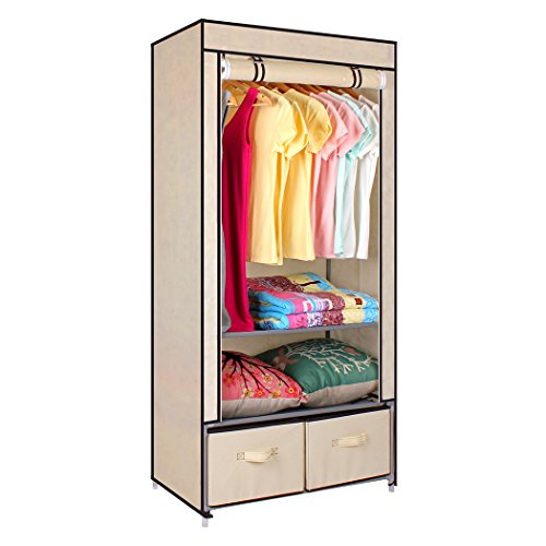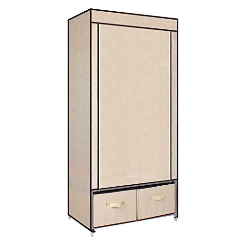 ASSICA Portable Single Clothes/Shoes Closet Wardrobe Organizer with 2 Storage Box Drawers Sturdy Rust-Proof Stainless Steel Frame Non-woven Fabric Rolling Door Home Use (beige)