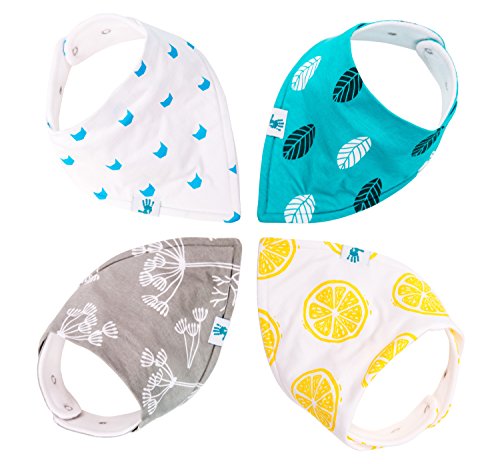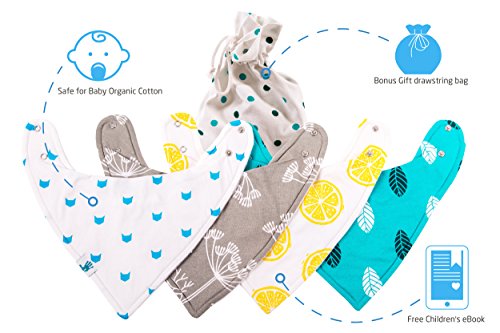 -. Title : Bandana Bibs - Best for Drools and Feeding - Organic Cotton/Waterproof Fleece - Set of 4 Unisex Drooling Bibs with Snaps - Cute Baby Shower Gift Set for Infants, Bag Included - by Manana