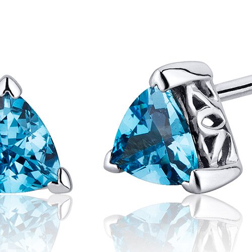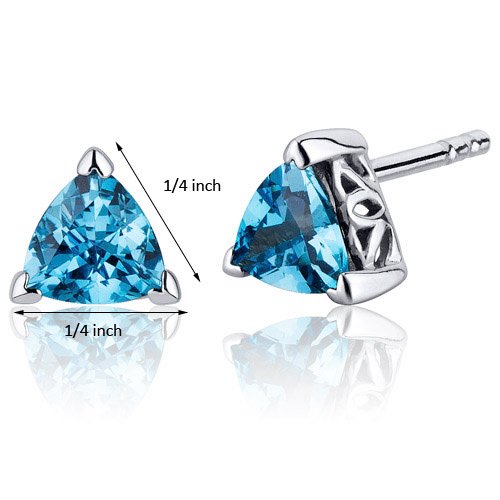Center Stone: 2 Pieces Genuine Swiss Blue Topaz, Trillion Cut 6 mm, 1.50 carats total weight, Lagoon Blue Hue with Brilliant Sparkle. Earrings: 2.00 grams, Pure Sterling Silver with .925 stamp, Earrings feature Stud posts with Bullet backs, exceptional Design, Craftsmanship anding. Perfect gift for Mothers Day, Birthdays, Valentines Day, Graduation, Christmas or just about any other occasion. Money Back Guarantee. Includes a Signature Gift Box & style SE8002Feature
