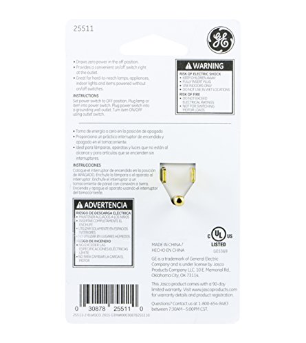 GE Grounded On/Off Power Switch, Plug-In, White, Energy Efficient, Space Saving Design, UL Listed, 15A, 120VAC, 1800W, 25511