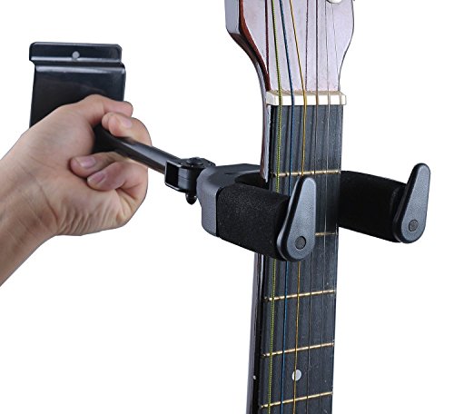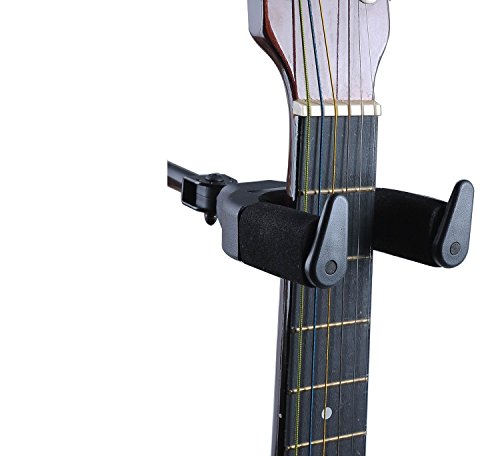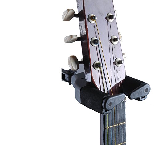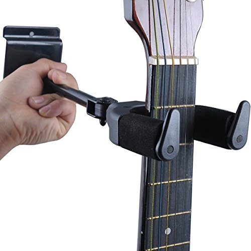 -. Feature : Unique gravity automatic lock design, can be more safe holding the guitar,Auto Grip System yoke safely and securely holds your instrument / Metal frame and plastic sleeve more durable from other wooden frame and soft sponge cover / Suitable for a variety of string instruments such as guitars, basses, violins, mandolins, ukeleles, and a lot more / Revolve device adjust multi-azimuth using that not stiffness to harm your instrument. / Auto lock yoke allows different shaped guitars and basses to hang vertically