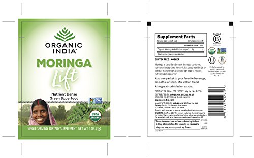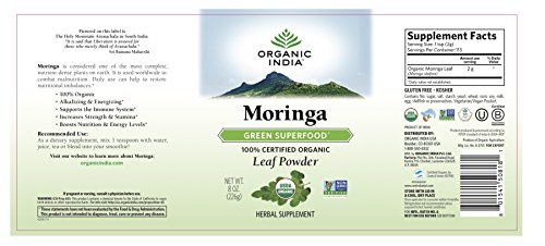 -. Binding : Health and Beauty -. Brand : ORGANIC INDIA -. Feature : NATURAL MORINGA POWDER - Enjoy the benefits from one of the most complete, nutrient-dense superfood plants on earth, with Organic India Moringa Powder. / FOR ESSENTIAL NUTRITION - Daily use of moringa oleifera powder nutritional supplement is an easy way to get an abundance of inherent vitamins, minerals and amino acids, the building blocks of protein. / BEYOND ORGANIC - Native to India and Africa, our moringa is grown using farming practices that not only adhere to organic farming standards, but go beyond, to regenerate the soil, protect biodiversity and be fully ethical and sustainable. / NATURAL REMEDY - Organic India Moringa Powder is Vegan, Vegetarian, Gluten Free, Non-GMO Project Verified, USDA-Certified Organic, Fair Trade Certified, and Kosher and Halal Certified. / GLOBAL WELLNESS LEADER - Organic India aims to create a global environment of true wellness, from training and supporting small family farmers in India to providing the highest quality health products available. -. Label : ORGANIC INDIA -. Manufacturer : ORGANIC INDIA -. MPN : 50817 -. PackageQuantity : 1 -. PartNumber : 50817 -. ProductGroup : Health and Beauty -. ProductTypeName : HEALTH_PERSONAL_CARE -. Publisher : ORGANIC INDIA -. Studio : ORGANIC INDIA -. Title : ORGANIC INDIA Moringa Powder Complex Superfood for Essential Nutrition - Abundant in Vitamins, Minerals and Amino Acids - Pure, Organic Moringa Oleifera Leaf Powder