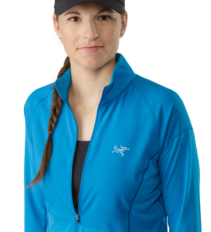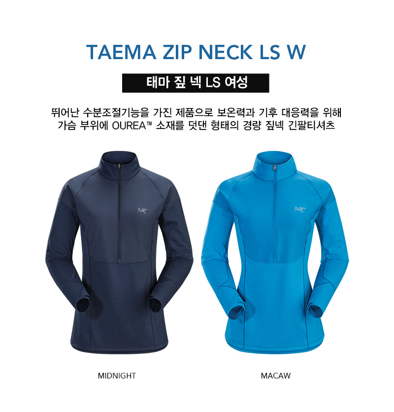 뛰어난 수분조절기능을 가진 제품으로 보온력과 기후 대응력을 위해 가슴 부위에 Ourea™소재를 덧댄 형태의 경량 짚 넥 긴팔 티셔츠