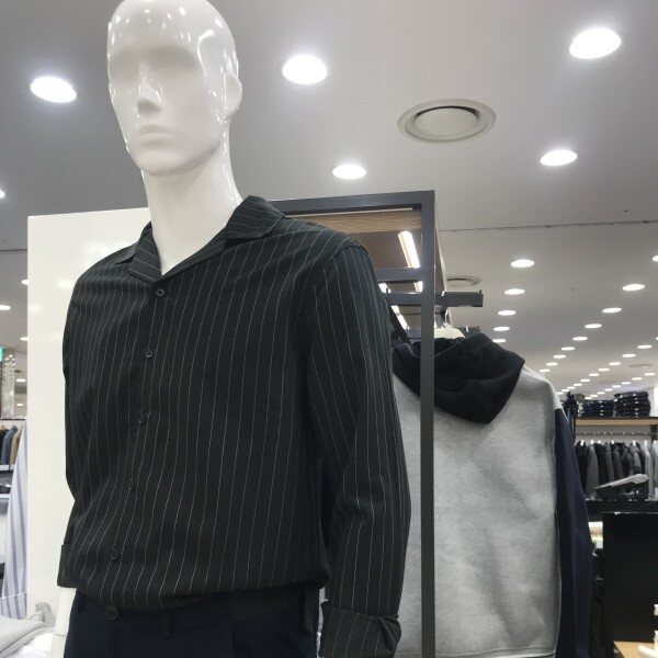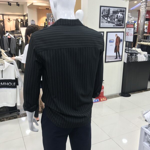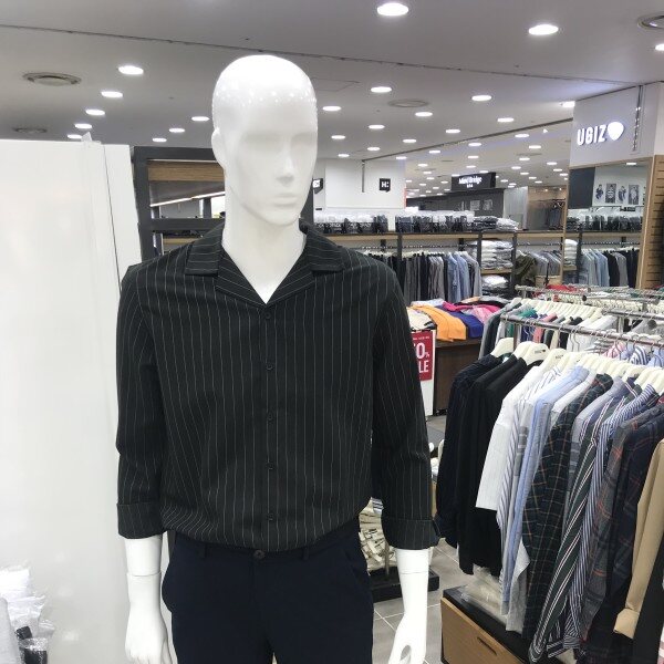 오픈카라에 네이비바탕에 줄무니 스트라이프가 멋진 살짝 루즈핏 셔츠입니다