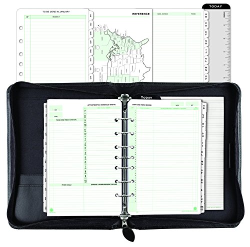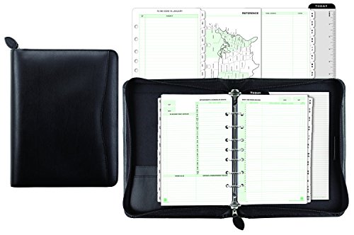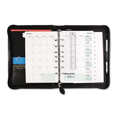 -. Feature : Includes everything you need to start planning: a full year of monthly tabs, a sampling of 3 of our most popular refill formats, tabbed address/phone directory, lined note pad, handy reference pages, and page locator; 8-1/2 x 10-5/8" overall size / Black bonded leather binder with zippered closure to secure contents; page dimensions 5-1/2" x 8-5/8"; 7-1" rings; Paper contents P.R.Inted on at least 30% post-consumer recycled paper; binder created with 75% recycled leather fibers / Accepts 5-1/2" x 8-1/2" Desk-sized Day-Timer refills and accessories; Includes pen loop, note pad pocket, angle pocket, and 3 horizontal pockets to organize your business essentials