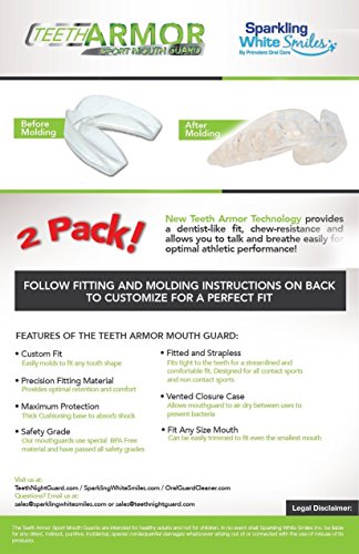 Studio : Primdent Oral Care Publisher : Primdent Oral Care Binding : Misc. Product Description 2 Pack! Each order includes 2 Size Small Teeth Armor Sport Mouth Guards and a Free carrying case. For Small Mouths; Youth and Petite Mouths. Designed for all athletes in contact and non contact sports. New Teeth Armor Technology provides a dentist like fit, chew resistance, and allows the athlete to talk and breathe easily for optimal athletic performance. The material is both BPA and Latex free. No color additives are used. Teeth Armor Sport Mouth Guards are clear in color. Get maximum teeth protection with Teeth Armor Mouth Guards thick cushioning base which absorbs shock during athletic play. Custom fit to any mouth size with Teeth Armor's precision fitting material. 0