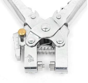 - DURABLE- Built-in hole punch with adjustable inset guide, die-cast zinc jaws, tool steel mandrel, brass anvil The heavy duty steel and aluminum of these pliers ensure that these won't break on the job. The high quality chrome finish also makes these pliers rust-resistant, adding greatly to the life of these pliers.