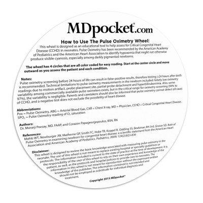 -. Feature : Quick identification of infants with congenital heart disease / Laminated for long lasting durability / Pulse oximetry screening for all neonates / Pocket wheel for easy storage and use