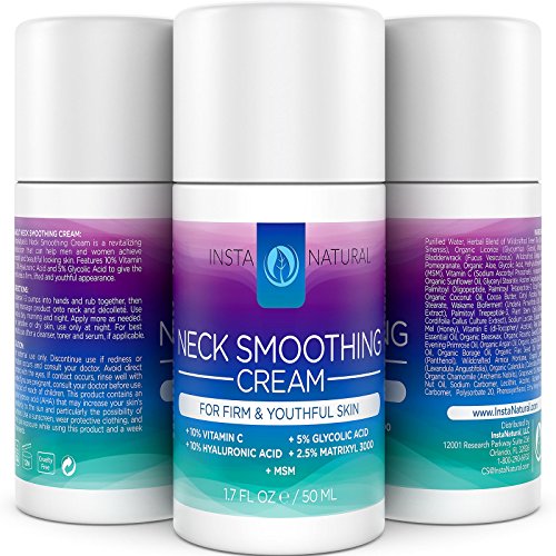 -. Binding : Misc. -. Brand : InstaNatural -. EAN : 0616913954950 -. Feature : FOR A FIRM & YOUNGER LOOKING SKIN - InstaNatural's Neck Smoothing Cream is a powerful skin firming and tightening formula that targets loose and sagging skin on the neck and décolleté area to give aging skin a lifted look that lasts. Are you ready to reclaim your youthful appearance once and for all? Try the best firming cream around. / SKIN REVITALIZING INGREDIENTS THAT WORK - This professional grade Neck Smoothing Cream is comprised of natural and organic medley of anti-aging ingredients such as Vitamin C, Hyaluronic Acid, Glycolic Acid, Cocoa Butter, Organic Argan Oil and Organic Jojoba Oil to give your skin a smooth and soothed look and feel. / FACIAL PRODUCTS AREN'T ENOUGH, AND HERE'S WHY → If you truly want to look younger and healthier, make sure your neck, décolleté and body look just as good as your face does! This premium creme offers the finest moisturizing age-defying ingredients around - such as Matrixyl 3000, MSM, Plant Stem Cells and more - to restore elasticity and achieve a uniform look that you'll absolutely love. / SAY GOODBYE TO THOSE SIGNS OF AGING - Countless men and women believe that wrinkled or sagging skin can't be helped. Not true! InstaNatural's Neck Smoothing Cream is specially formulated to reduce the appearance of wrinkles, fine lines, creases and sagging skin like no other. Your skin will be firm, soft, supple and hydrated beyond compare. / FOR AN EVEN & HEALTHY APPEARANCE - InstaNatural's Neck Smoothing Cream contains 10% of Vitamin C to encourage collagen production throughout the neck and décolleté. This lotion also provides premium antioxidant protection against UV and free radical damage, while also evening your skin tone by reducing spots and discoloration. -. ProductGroup : Beauty -. ProductTypeName : BEAUTY -. Title : Neck Firming Cream - Smoothening and Tightening Lotion to Lift Sagging Skin - Best Moisturizer Creme for Wrinkles & Fine Lines - With Vitamin C, Glycolic Acid & Hyaluronic Acid - InstaNatural - 1.7 OZ -. UPC : 616913954950