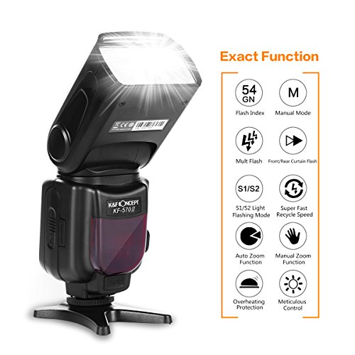 This speedlite is universal for Canon and Nikon DSLR and of which the guide No. is GN54(ISO100 180MM).
