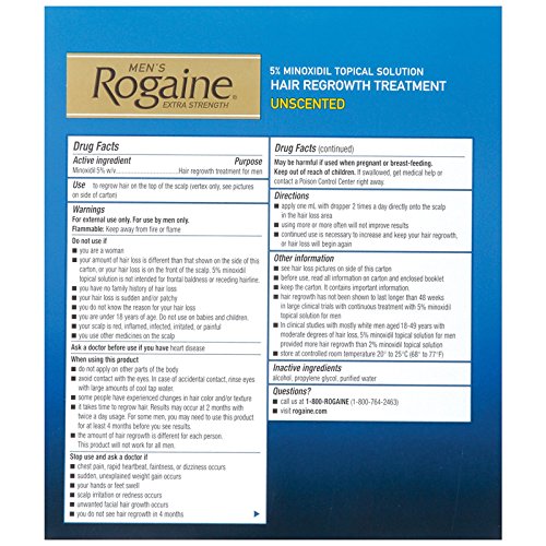 A Closer Look: Men's Rogaine Extra Strength Topical Solution comes with five percent Minoxidil to rejuvenate shrunken hair follicles by increasing their size. Larger follicles produce a thicker growth of hair.