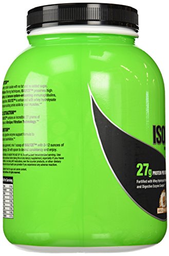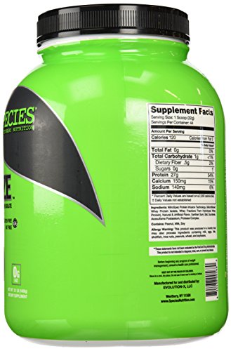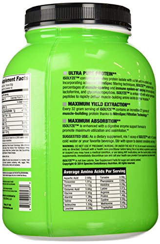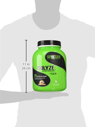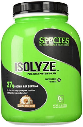 -. Binding : Health and Beauty -. Brand : Species Nutrition -. EAN : 0855438005680 -. Feature : Every 32 gram serving of isolyze contains an incredible 27 grams of muscle-building protein thanks to nitro spec filtration technology / Fortified with whey hydrosol ate peptides and digestive enzyme complex / Fat free, gluten free and ultra pure protein -. IsAdultProduct : 0 -. Label : Species Nutrition -. LegalDisclaimer : Do not use if pregnant, nursing, or under the age of 18. Do not exceed recommended serving. Use only as directed. Consult with a health care practitioner before taking this or any dietary supplement, especially if you have or suspect you may have a medical condition, or are taking any medications, over the counter products, or other dietary supplements. Immediately discontinue use and call your health care provider if you experience any adverse reaction. Contains: Milk, Soy. Allergy -. Manufacturer : Species Nutrition -. Model : 8330010 -. MPN : 8330010 -. NumberOfItems : 1 -. PackageQuantity : 1 -. PartNumber : 8330010 -. ProductGroup : Health and Beauty -. ProductTypeName : HEALTH_PERSONAL_CARE -. PublicationDate : 2014-10-17 -. Publisher : Species Nutrition -. ReleaseDate : 2014-10-14 -. Studio : Species Nutrition -. Title : Species Nutrition Isolyze Peanut Butter Supplement, Vanilla, 3.1 Pound -. UPC : 855438005680