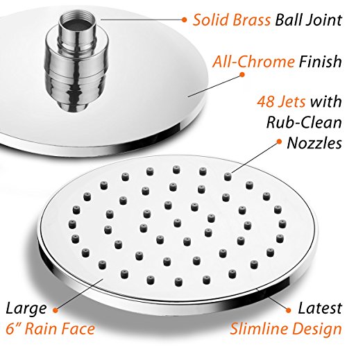 EXTRA-LARGE RAINFALL SHOWERHEAD: • Large 6-inch Face for wider water flow coverage • 48 Jets with Rub-Clean Nozzles for easy cleaning • Angle-adjustable • Leak-free connection • Premium All-Chrome finish MULTI-SETTING HANDSHOWER WITH PUSH BUTTON FLOW CONTROL: Giant 5-inch face • Can be used as overhead or handheld shower • Revolutionary push-button flow control for one-hand operation • 59 Power Rain Jets and 8 Massage Jets • Rub-Free jets for easy cleaning