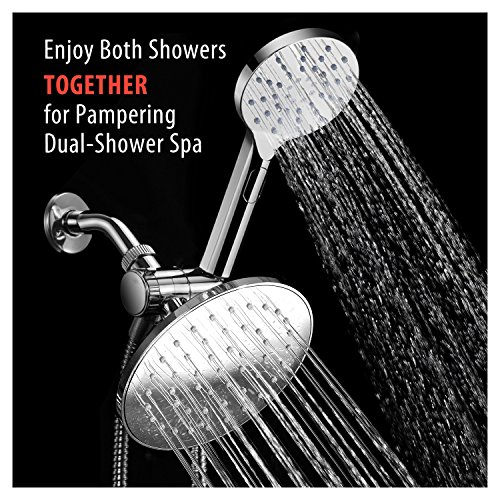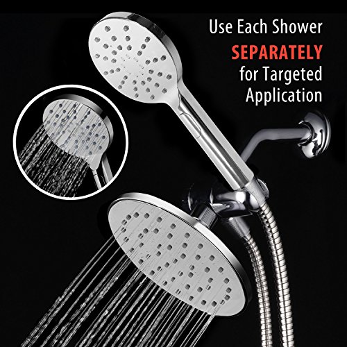 RAINFALL SHOWER COMBO WITH PUSH-BUTTON CONTROL FLOW CONTROL: Use luxurious rain shower head for drenching rainfall shower, pamper with new state-of-the-art hand shower featuring convenient push-button flow control or enjoy both showers together for Pampering Dual Shower Spa • No dial to turn, SIMPLY PUSH THE FLOW-CONTROL BUTTON with your thumb