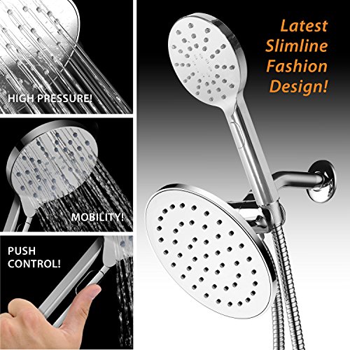 AquaSpa 6-inch Rain Shower Head / Handheld Combo. Convenient Push-Button Flow Control Button for easy one-handed operation. Switch flow settings with the same hand! Premium Chrome