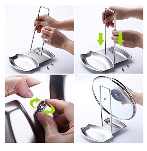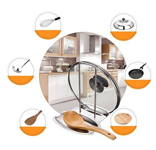 Studio : YOMYM Publisher : YOMYM Binding : Kitchen Product Description No place to put your spoon or pot cover? YOMYM Pan Pot Cover Lid Rack specializes in solving this awkward problem for you! Compatible with your home pot, spoon, spoon, let your stove keep clean and tidy. Drying convenient, dry and ventilated to avoid the proliferation of bacteria. Food grade stainless steel, durable, rustproof, safe to use. Your kitchen first selection. Package Include: 1*Pan Pot Cover Lid Rack.