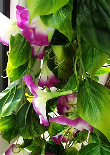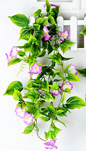Each fake hanging vine plant has 18 flowers and 105 leaves. The total length of one strand is 94 inches and the morning glory heads are 2.36 inches.