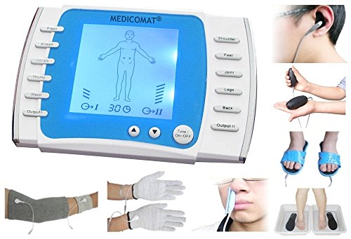 -. Feature : Medicomat® Medical Automat Series * THE WORLD'S BEST HEALTHCARE APPARATUS / Tennis Elbow Treatment Physiotherapy * 10 Treatment Modes: Press Knead Vibrate Thump Waist Shoulder Feet Joint Legs Back. Easy to Operate * Electricity & Batteries * Screen & Time Set * Voice Guide * 2 x Output for Therapy * Double Effect - You can use them simultaneously and choose two therapies at same time for the better therapeutic effect. / The conductive garments are made with high quality silver fiber threads which conduct the electrical impulses throughout the whole garment, providing acupuncture and electrotherapy stimulation over the complete area covered by the garment. Producing an even distribution of stimulation giving maximum comfort and efficiency, and complete ease of use. / Medicomat ear acupuncture provides a fully automatic treatment for the whole body, complemented by the effects of Wrist and Nasal Semiconductor low-level (output 1-5mW, wavelength 650nm) Laser Irradiation Therapy and body acupuncture massage therapy through the palm and foot electrodes and conductive silver fiber garments gloves, wristlet and elbow. / Free Shipping Worldwide - Delivery of this item is carried out from Hong Kong by express courier services. Read more at Medicomat.com and view product video at Medicomat.com/yt21.php