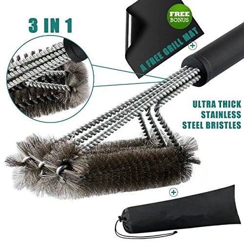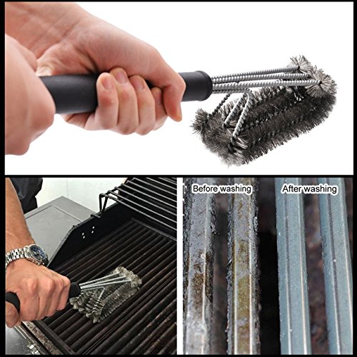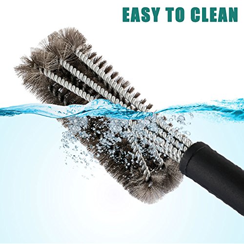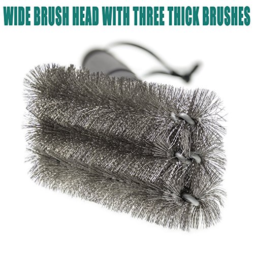 Superior BBQ Cleaning Brush: 18" barbeque brush combines 3 brushes in one to clean maximum grilling area with each stroke. Say goodbye to grilling residues and grime with a hassle free 360 degree rotatable cleaning brush. Perfect BBQ cleaning accessory. Expect this brush to clean any grilling surface up to 5 times faster than standard grilling brushes. Easy to maneuver grill cleaning brush can reach the toughest spots, scraping leftovers from every nook, crevice