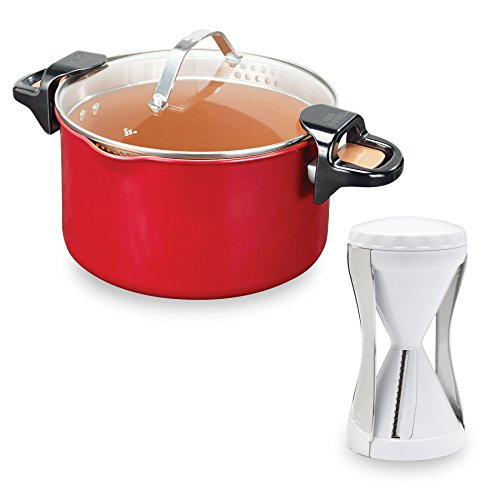 One Pot Wonder Why dirty two dishes when you can cook and strain using just one pot? Easier clean ups are just a meal away with the five-quart Red Copper Better Pasta Pot. This unique pot includes stay-cool, locking handles for safely straining water and grease. A tempered glass lid gives you the choice of using large or small straining holes, making it easy to cook pasta of any size, from ravioli to orzo. Just lift, lock, and drain! The Red Copper Difference Made from tough grade, PFOA and PFTE-free copper-infused ceramic, the Red Copper Better Pasta Pot's non-stick surface allows you to cook without oil, butter, or sprays, while anti-scratch technology keeps your pot smooth and ready to use for years to come. More Than Pasta Use your Red Copper Better Pasta Pot for: Delicious one pot chili Boiling potatoes Soups and stew smelting chocolate Cooking vegetables And More Offer includes:1 Red Copper Pasta Pot Tempered glass lid Recipe guide Packaging may vary. Item may not ship in retail packaging. Get Your Better Pasta Pot Today!.Feature