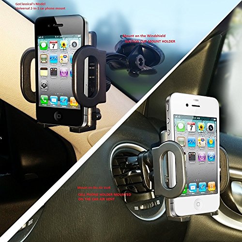 -. Feature : • CUSTOMERS, THIS IS YOUR OWN CHOICE, and now you've got no reason again to complain - EVER! Why? Simple: Because YOU are the very ones we listened to on your complaints about what YOU say is what want the most in car cell phone mounts and holders! And so, based on that, we had gone to "the drawing board" to upgrade and improve on the device! Now, with this new model from GoClassical, you've got yourselves just about everything you YOURSELF wish (and say) you want / WANT TO MOUNT ON THE WINDSHIELD (could be on your phone or your GPS)? No problem. Our suction cup system is one of the new generation suction cups that lock to any smooth or textured surface like the dashboard, hereby allowing it to be placed almost anywhere in your vehicle. And the result? With this model, there'll simply be NO MORE the old problem that plague many users of such suction cup cell phone holder mounts - such as the suction falling off just for making a simple sharp turn or bump / Or, alternatively, DO YOU PREFER TO MOUNT IT ON YOUR AIR VENT? No problem. With its special air vent attachment feature (it has two "legs" on the bottom which keeps it from sagging) that gets deep into the air vent, this ensures that the mount remains secured in place and is stable. With the use of our air vent clip holder or air vent mount holder, that immediately means there'll be no more falling off of your phone off the windshield - EVER! Holds the phone (or GPS) very firmly and securely. / INSTALLS EASY, LITERALLY IN SECONDS - for the Windshield clip holder or the AIR VENT mount holder. A special installation instructions and/or video is provided. Plus, it's easy to release, easy to clean. The result? And what this immediately TRANSLATES to for you? You'd get NO MORE falling of your phone off the windshield mount or the air vent mount; probably ever again! The clamp at the phone's back has a 360-degree adjustable swiveling feature, meaning you can rotate phone to almost wherever / THE PHONE BECOMING LOOSE OR SLIPPING OFF ON YOU? PROBABLY NEVER AGAIN - EVER! That's because of the system's special design (specifically that particular portion of the whole system that houses the phone or GPS). There is an easy-to-press switch to unlock the extending arms, hence it doesn't and would almost NEVER, EVER automatically pop open or drop the phone on you. Will always keep your device securely in place even on the bumpiest of terrains, and the mount stays perfectly attached to phone